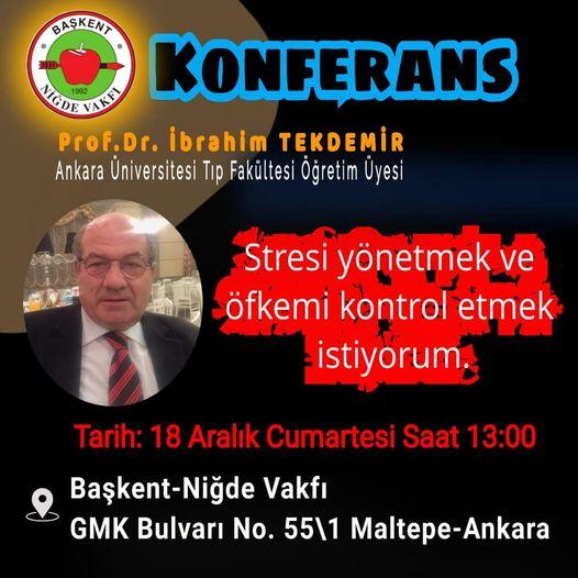 18 Aralık Cumartesi günü Saat 13.00'da Vakfımızda yapılacak olan (GMK Bulvarı 55/1 Maltepe-ANKARA) Prof. Dr. İbrahim TEKDEMİR'in (Ankara Üniversitesi Tıp Fakültesi Öğretim Üyesi) "Stresi Yönetmek ve Öfkemi Kontrol Etmek İstiyorum" adlı konferansına katılımlarınızı bekleriz.